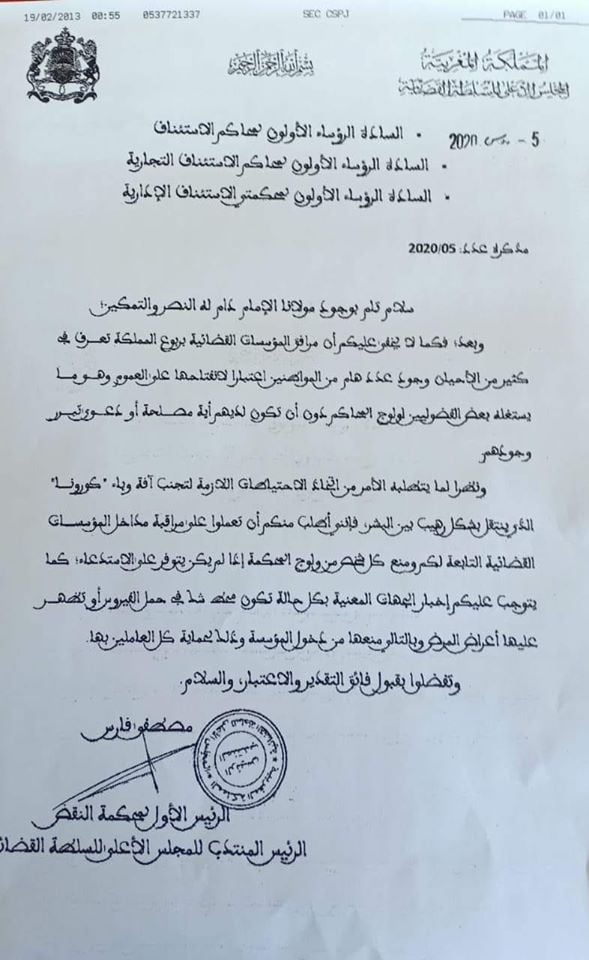 توصل الرؤساء الأولون لمحاكم الإستئناف ومحاكم الإستئناف التجارية ومحكمتي الإستئناف الإدارية، بمذكرة وجهها الرئيس الأول لمحكمة النقض والرئيس المنتدب للمجلس الأعلى للسلطة القضائية مصطفى فارس، حول اتخاذ الإحتياطات اللازمة لتجنب فيروس كورونا.
