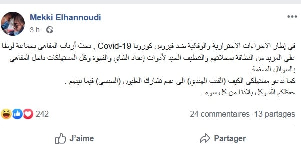 في تدوينة مثيرة على فيسبوك، وفي إطار الاجراءات الاحترازية والوقائية ضد فيروس كورونا Covid-19 ، حث المكي الحنودي ـ رئيس جماعة لوطا بإقليم الحسيمة ، أرباب المقاهي على بذل "المزيد من النظافة بمحلاتهم والتنظيف الجيد لأدوات إعداد الشاي والقهوة وكل المستهلكات داخل المقاهي بالسوائل المعقمة" .
