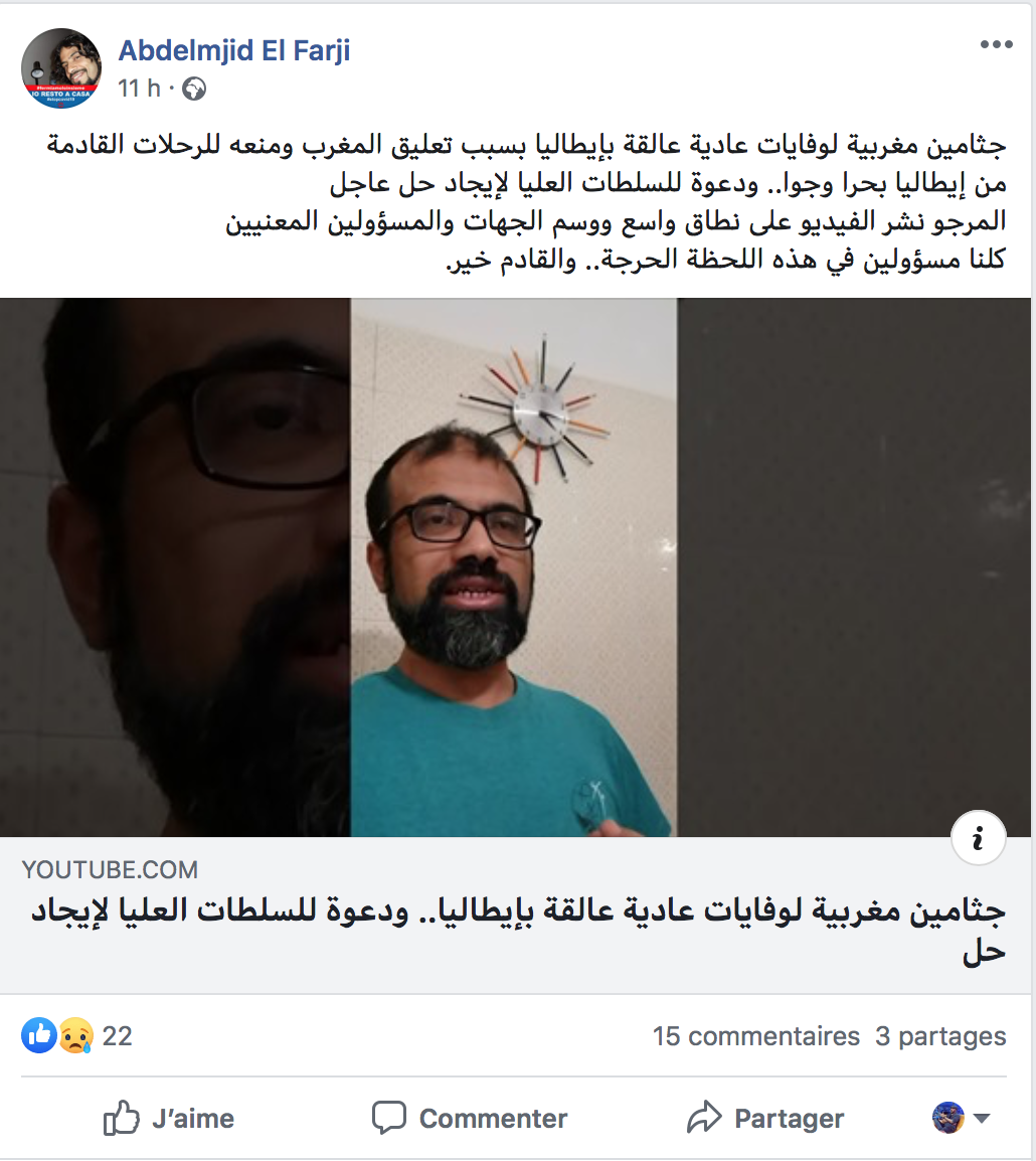 الفرجي الذي وجه نداء إلى السلطات العليا بالمغرب، من خلال شريط فيديو، نشره عبر حسابه الفيسبوكي، طالب بضرورة إيجاد حل عاجل لهذا المشكل، حيث قدم بعض الحلول التي يمكن الاستعانة ببعضها، من أجل التخفيف من حزن وأسى أهالي المتوفين، سواء بإيطاليا أو المغرب (الفيديو):