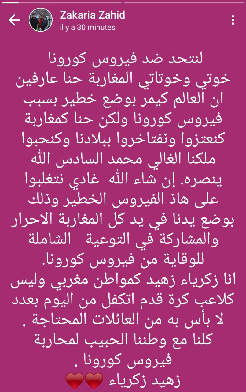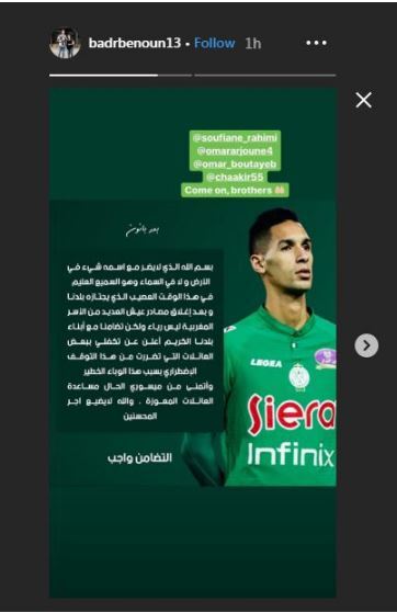 وانضم الرجاوي السابق، عصام الراقي، إلى لائحة نجوم البطولة الذين أعلنوا تضامنهم مع الأسر المغربية المتضررة، حيث قال في تدوينة "بدوري أنا عصام الراقي أعلن عن تكفلي ببعض العائلات المعوزة و المحتاجة و توفير قفة كاملة اللوازم لكل واحدة منهم طوال هذه الأزمة حتى نتخطى هذا العائق بسلام إن شاء الله".