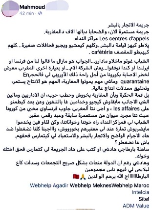 وبحسب عدد من التدوينات التي جرى نشرها عبر الفيسبوك، فإن حالة من الرعب الحقيقي يعيشها العاملين بمراكز النداء المنتشرة عبر ربوع المملكة، بسبب ظروف الاشتغال، حيث يتكدس المئات من المستخدمين داخل فضاءات تنعدم فيها شروط الوقاية من هذا الوباء، الأمر الذي يجعل من إمكانية انتشار الفيروس سهلا جدا، دون الحديث عن تنقلهم عبر حافلات صغيرة.