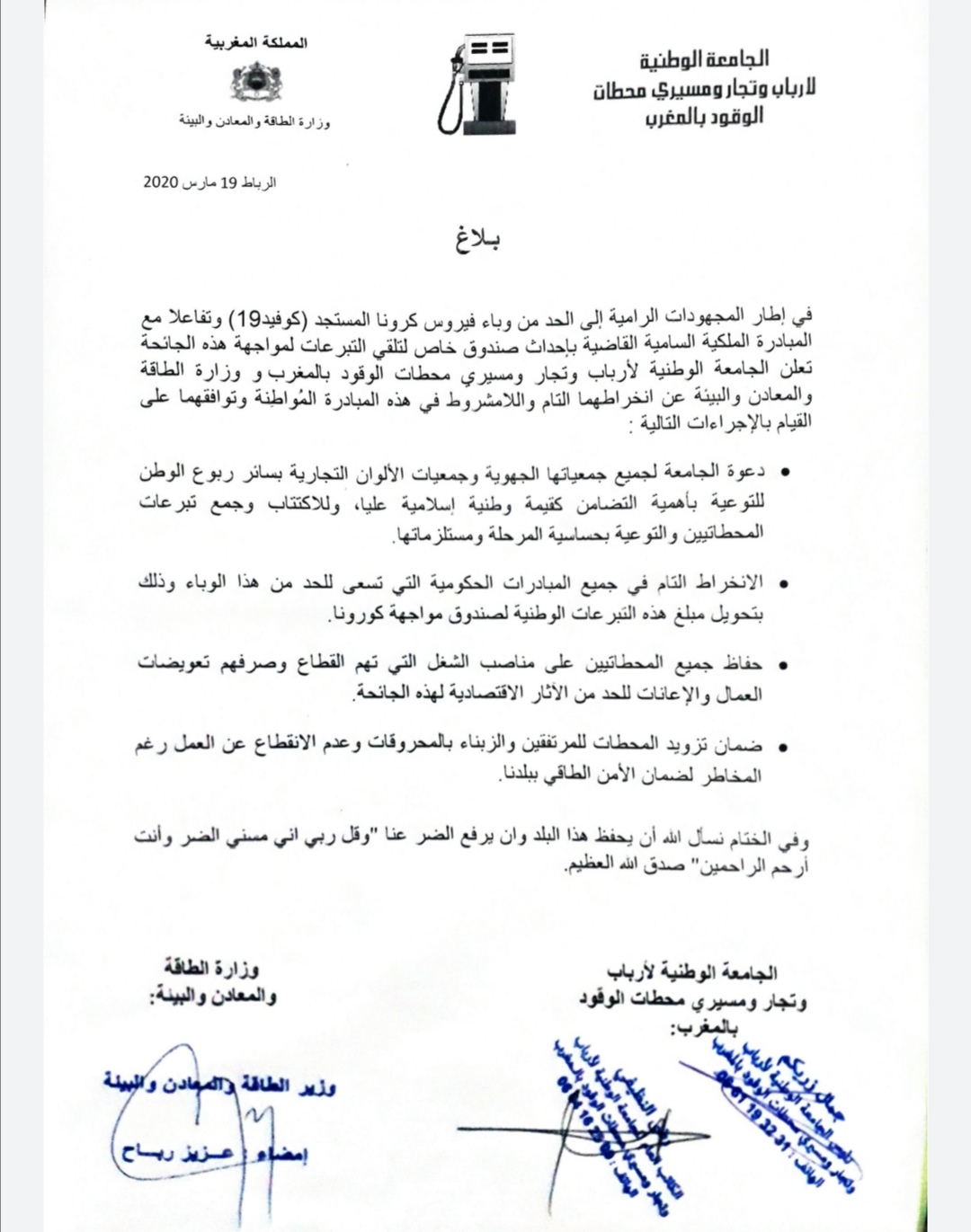 أصحاب البلاغ أكدوا كذلك على حفاظ جميع المحطاتيين على مناصب الشغل التي تهم القطاع، مع صرفهم تعويضات للعمال وإعانات للحد من الآثار الإقتصادية لهذه الجائحة، مع ضمان تزويد محطات الخدمة للزبناء والمستهلكين بالمحروقات دون انقطاع للعمل رغم المخاطر ضمانا للأمن الطاقي للمملكة.