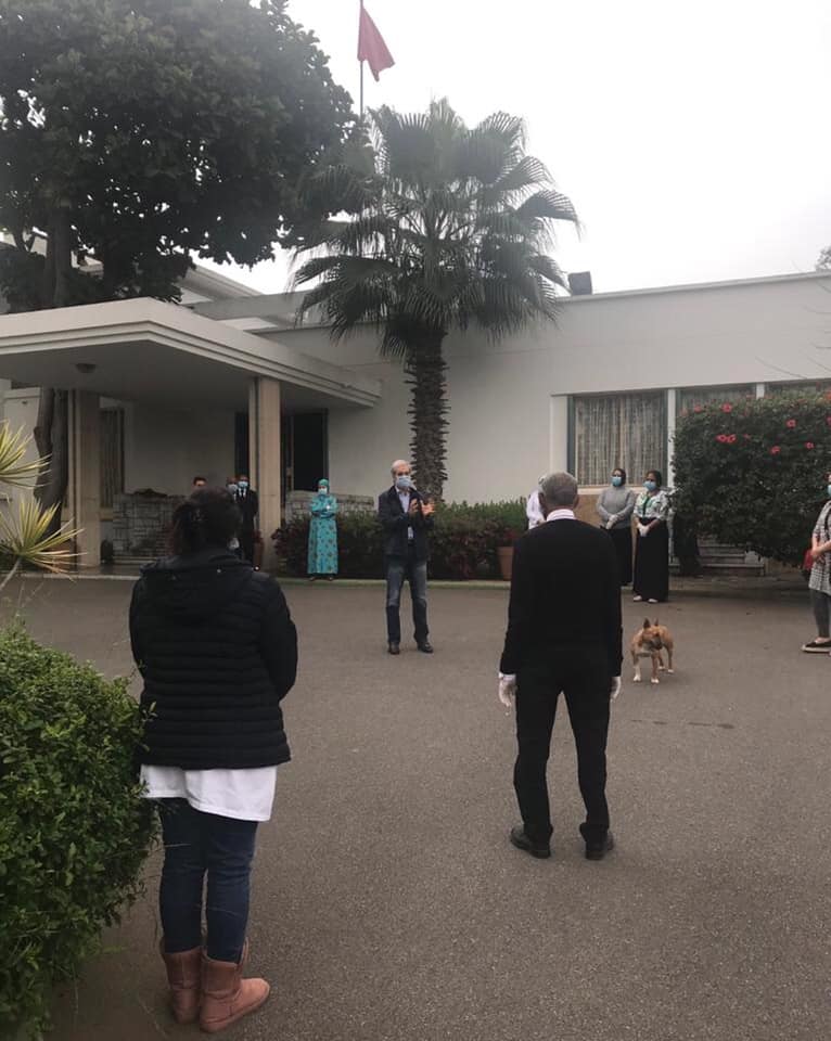 صورة لي وأنا أشرح للعاملين في منزلنا إجراءات الوقاية الضرورية، وأشكرهم باسمي وباسم عائلتي على عملهم.