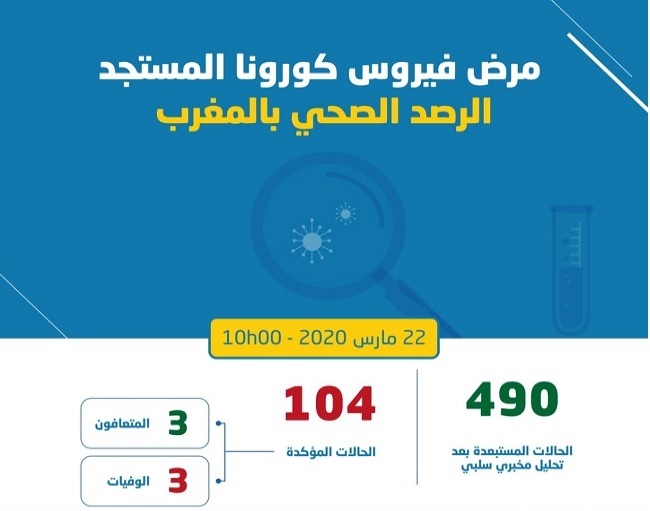 أعلنت وزارة الصحة إلى الرأي العام أنه تم إلى حدود اليوم الأحد 22 مارس 2020 وإلى غاية الساعة العاشرة صباحا، تسجيل ما مجموعه 104 حالة إصابة مؤكدة بفيروس كورونا المستجد، تم تأكيدها مخبريا بمعهد باستور-المغرب والمختبر الوطني للأنفلونزا والفيروسات التنفسية بالمعهد الوطني للصحة بالرباط، ومختبر المستشفى العسكري.