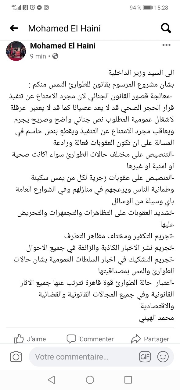 كما طالب الهيني بضرورة:" التنصيص على مختلف حالات الطوارئ سواء أكانت صحية أو امنية أو غيرها"، مؤكدا على أهمية : "التنصيص على عقوبات زجرية لكل من يمس سكينة وطمانية الناس ويزعجهم في منازلهم وفي الشوارع العامة بأي وسيلة من الوسائل"، وكذا:" تشديد العقوبات على التظاهرات والتجمهرات والتحريض عليها، وتجريم التكفير ومختلف مظاهر التطرف، وأيضا تجريم نشر الاخبار الكاذبة والزائفة في جميع الاحوال، مع ضرورة تجريم التشكيك في اخبار السلطات العمومية بشان حالات الطوارئ والمس بمصداقيتها.