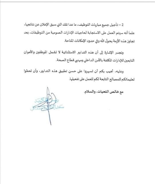 كما يتعلق بالأمر، يضيف منشور رئيس الحكومة، بتأجيل جميع مباريات التوظيف، ما عدا تلك التي سبق الإعلان عن نتائجها، علما أنه سيتم العمل على الاستجابة لحاجيات الإدارات العمومية من التوظيفات، بعد تجاوز هذه الأزمة وفي حدود الإمكانات المتاحة.