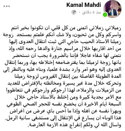 وتابع نقيب المحامين قائلا "وإذ نتمنى لها شفاء عاجلا فإننا بالضرورة يجب أن نستحضر بأنها زوجة لزميلنا بما يفترض معه إختلاطه بها، وربما إنتقال العدوى إليه وهو أمر وارد بشدة علميا"، مضيفا "وبناء عليه وبالنظر إلى المدة الطويلة الفاصلة بين إنتقال الفيروس لزوجة زميلنا وتحركه خلال مدة غير يسيرة ومخالطته بالإفتراض للعديد من الزميلات والزملاء، لهذا ارجوكن وأرجوكم في ان تتعاطووا مع الأمر بجدية كبيرة،ومن إختلط بالأستاذ حاجي خلال السبعة أيام الأخيرة أن يخضع نفسه للحجر الصحي الطوعي ويعزل نفسه عن أهله وإذا ما أحس بأي عرض من أغراض هذا الوباء أن يسارع في الإنتقال إلى مستشفى سانية الرمل. وأسأل الله لي ولكم إنفراج هذه الأزمة العارضة".