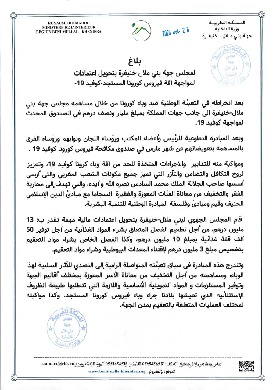 توصل الموقع ببلاغ من مجلس جهة بني ملال خنيفرة ، يعلن من خلاله عن تحويل اعتمادات مالية مهمة ب 13 مليون درهم "مليار و300 مليون سنتيم" ، من أجل شراء مواد غذائية لتوفير 50 ألف قفة غذائية للفئات المعوزة بمبلغ مليار سنتيم ، مع تخصيص 300 مليون سنتيم لاقتناء مواد التعقيم.