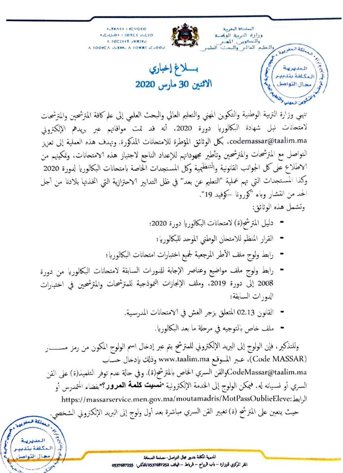 أعلنت وزارة التربية الوطنية والتكوين المهني والتعليم العالي والبحث العلمي، اليوم الاثنين، أنها قامت بموافاة كافة المترشحين والمترشحات لامتحانات نيل شهادة البكالوريا دورة 2020 بكل الوثائق المؤطرة لهذه الامتحانات، عبر بريدهم الإلكتروني [email protected].