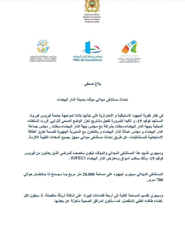 ستشهد مدينة الدار البيضاء إحداث مستشفى ميداني مؤقت تناهز طاقته الاستيعابية 700 سرير، وذلك في إطار تقوية الجهود الاستباقية والاحترازية التي تبذلها المملكة لمواجهة جائحة فيروس كورونا المستجد (كوفيد 19).