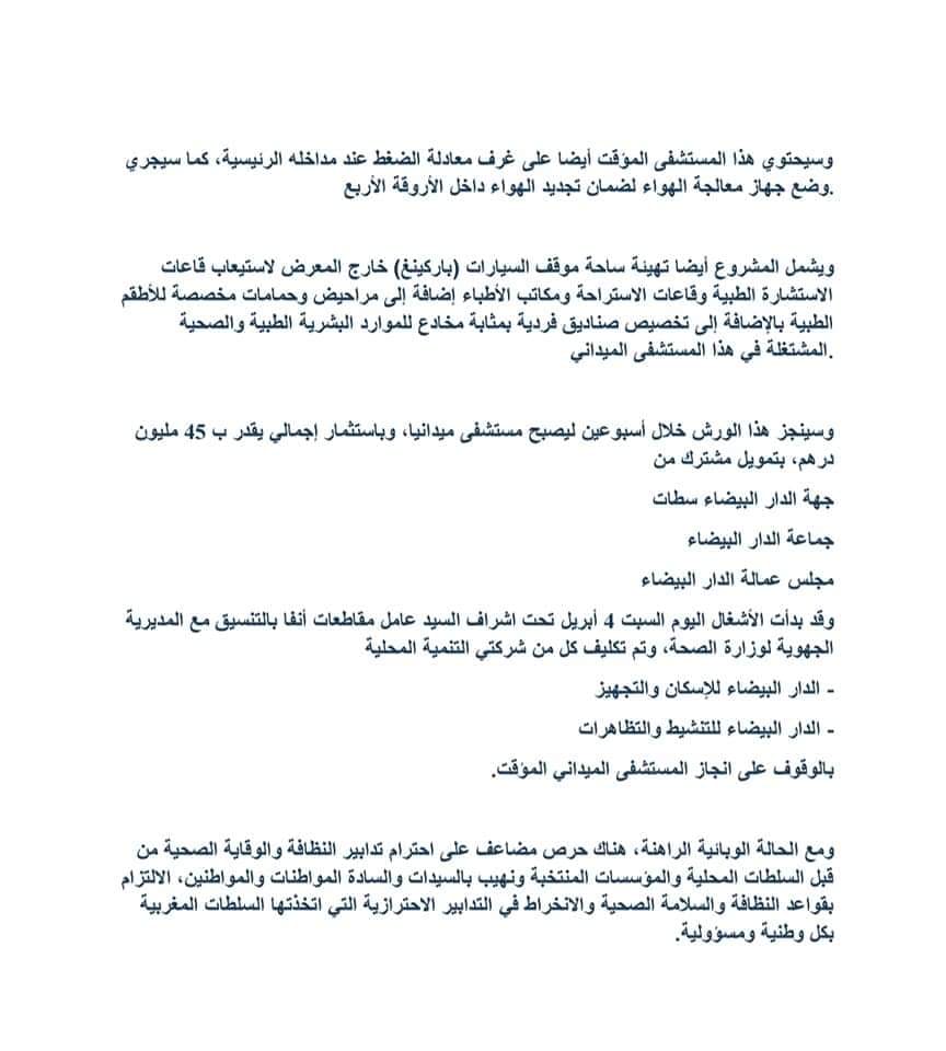 وأضاف أن إنجاز هذا المشروع، من طرف السلطات المحلية بجهة الدار البيضاء -سطات بتعاون مع مجلس الجهة ومجلسي الجماعة والعمالة، وبالتعاون مع المديرية الجهوية للصحة، سيتم على مساحة تقدر بـ 20 ألف متر مربع، سيجري توزيعها على أربعة فضاءات كبيرة منفصلة عن بعضها البعض، حيث سيكون لكل فضاء طاقمه الطبي المنفصل.