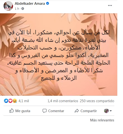 وعبر المسؤول في تدوينة على حسابه بالفايسبوك، اليوم الثلاثاء عن شكره للأطباء والممرضين وكافة أصدقائه وزملائه.