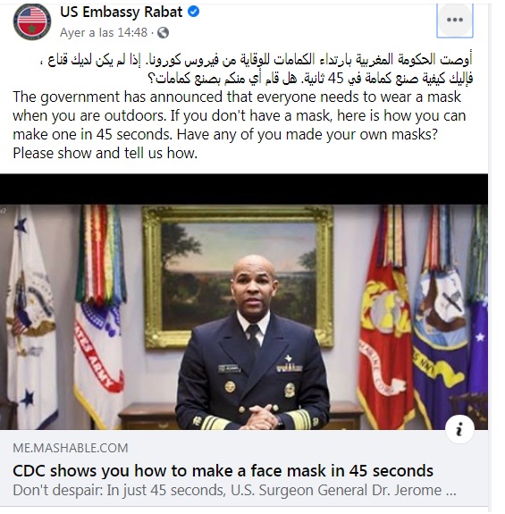 شاركت السفارة الأمريكية بالمغرب أمس الثلاثاء على صفحتها في موقع فيسبوك، مقطع فيديو توضيحي، عن كيفية صنع الكمامات في المنزل.