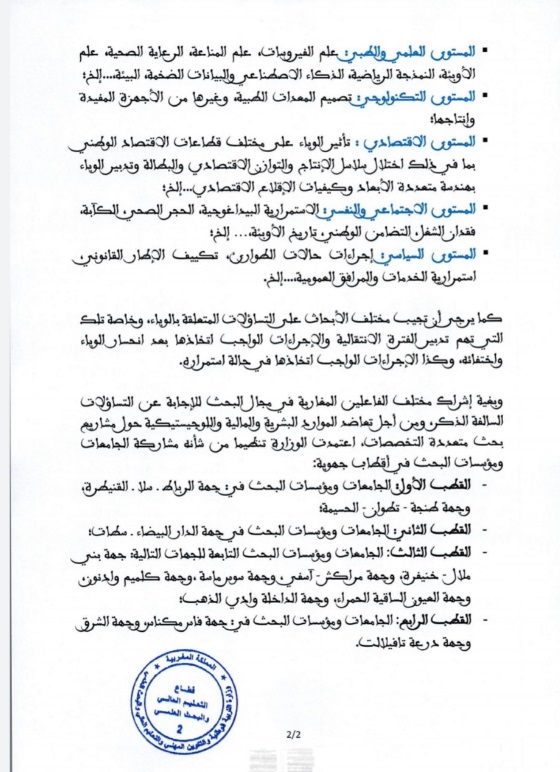 ولفت الوزارة إلى أنها بغية إشراك مختلف الفاعلين المغاربة في مجال البحث للإجابة عن هذه التساؤلات ومن أجل تعاضد الموارد البشرية والمالية واللوجيستيكية حول مشاريع بحث متعددة التخصصات، اعتمدت تنظيما من شأنه مشاركة الجامعات ومؤسسات البحث في أربعة أقطاب جهوية.