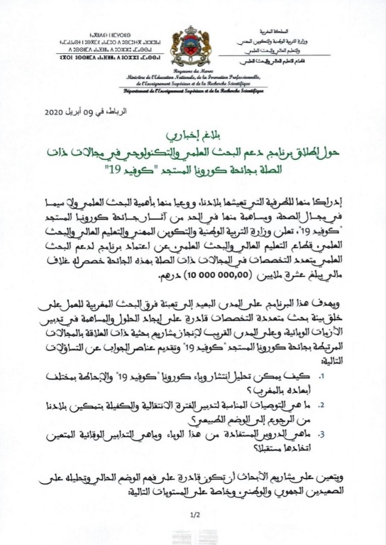 أعلنت وزارة أمزازي، من خلال قطاع التعليم العالي والبحث العلمي، عن اعتمادها برنامجا لدعم البحث العلمي متعدد التخصصات في المجالات ذات الصلة بجائحة كورونا خصص له غلاف مالي يبلغ مليار سنتيم.