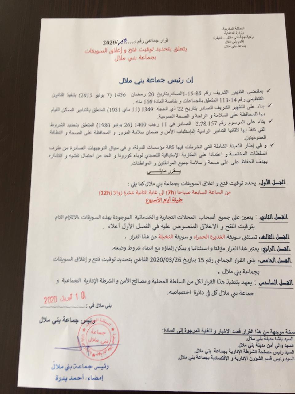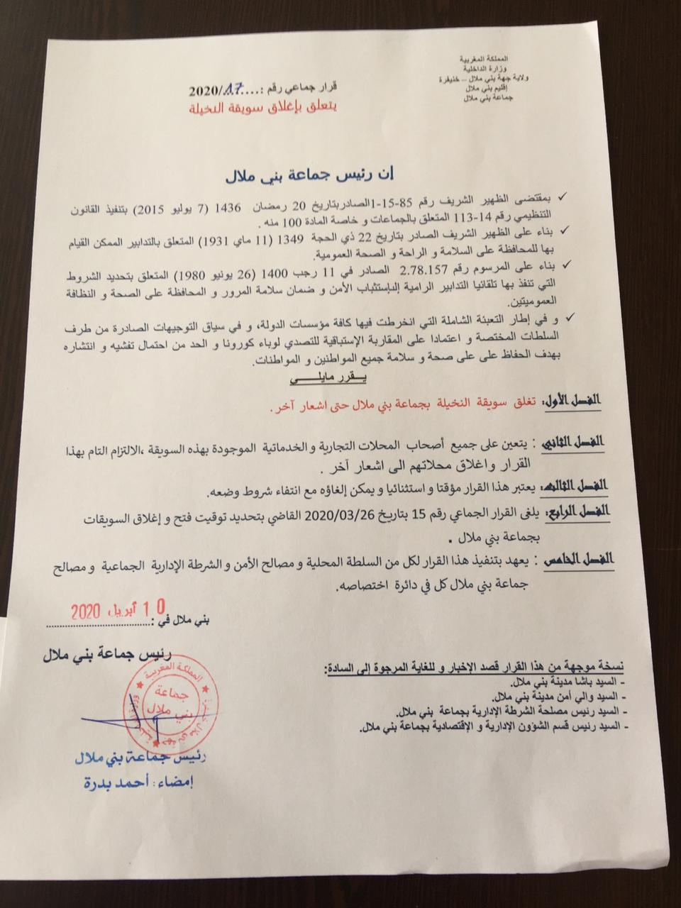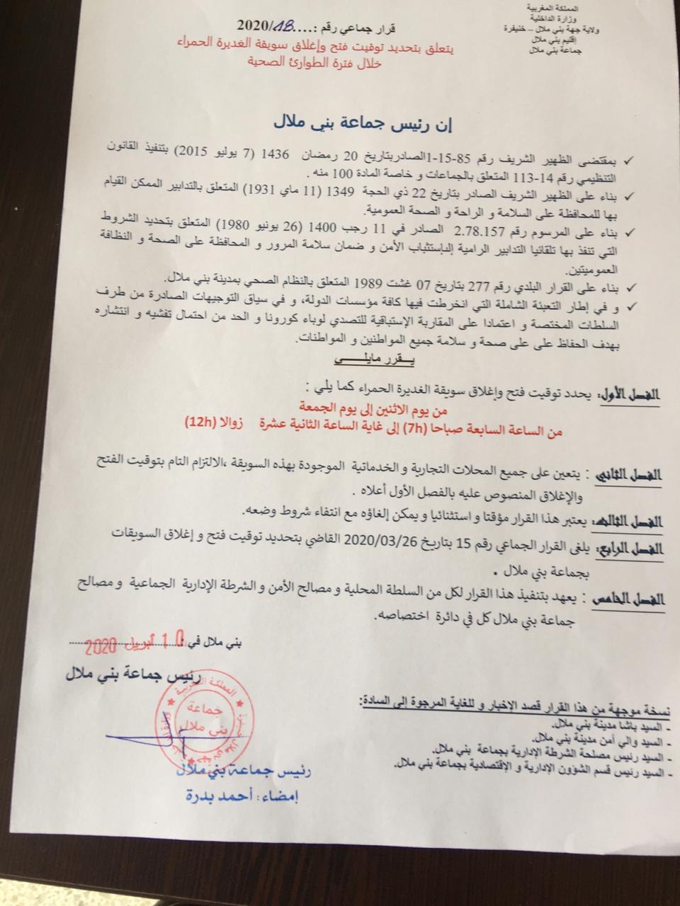توصل موقع "أخبارنا" من المجلس الجماعي لبني ملال بثلاث قرارات جماعية تتعلق بتنظيم أوقات فتح وإغلاق سويقات المدينة، حيث يتعلق القرار الأول باغلاق تام لسويقة النخيلة وجميع محلاتها إلى إشعار آخر، والقرار الثاني يهم إغلاق سويقة الغديرة الحمراء ومحلاتها يومي السبت والأحد.