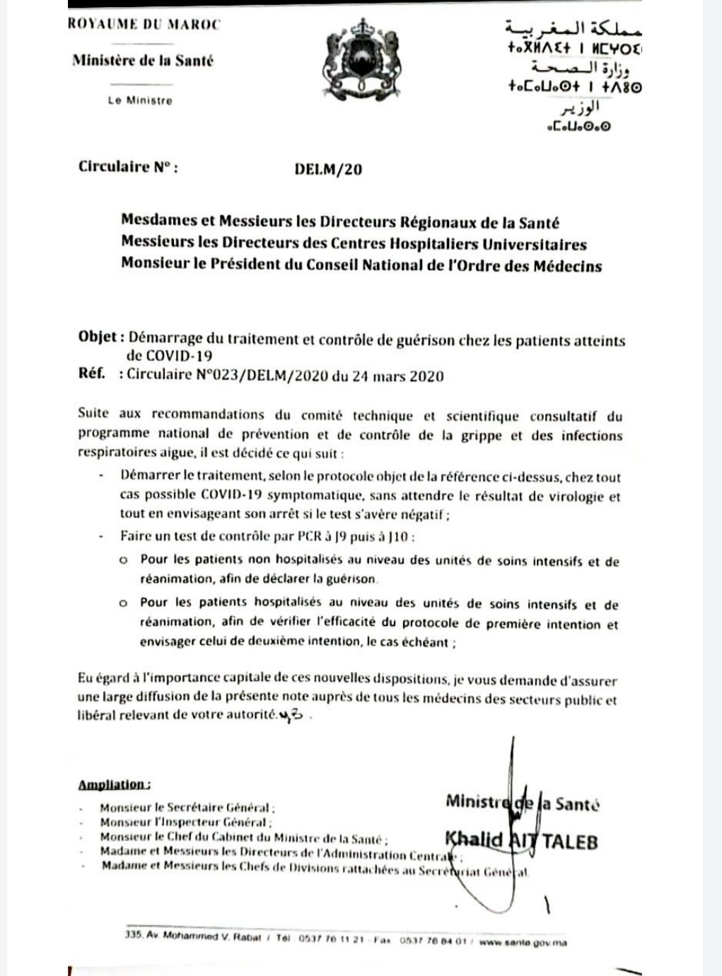 يومين أو ثلاث على صدور دورية وزير الصحة خرجت رسالة صوتية مسجلة للبروفيسور العراقي كخبير ومتخصص واستاذ للأمراض التنفسية لحيز عوالم التواصل الإجتماعي والتي دافع من خلالها كمتخصص وكخبير عن طرح معالجة المشتبه بإصافتهم بفيروس كورونا 19 في انتظار نتائج التحاليل، وأكد المتحدث عن ضرورة الشروع في تقديم بروتوكول العلاج بالكلوروكين للمشتبه بهم ولمن تظهر عليهم العلامات ولمحيطهم كذلك بانتظار نتائج التحليلات، وهي عملية أقل تكلفة وستعطي نتائج ممتازة، داعيا في ذات الوقت إلى الإبتعاد عن نهج الدول الأوروبية وكوريا الجنوبية وهي دول متقدمة وغنية وإيجاد نموذج خاص بنا بالمغرب.
