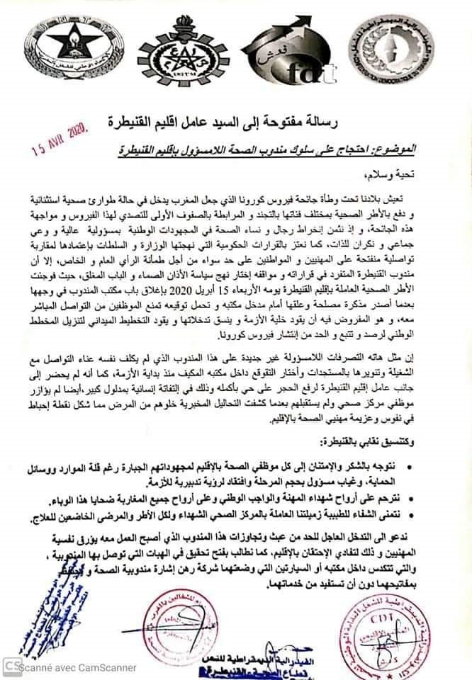 وقالت النقابات في رسالتها الموجهة إلى عامل الاقليم والتي تحصل الموقع على نسخة منها، أن المفترض في المندوب الذي أقفل مكتبه في وجه الموظفين أن يقود خلية الازمة وينسيق تدخلاتها ويقود التخطيط الميداني لتنزيل المخطط الوطني للرصد والتتبع والحد من انتشار كورونا.