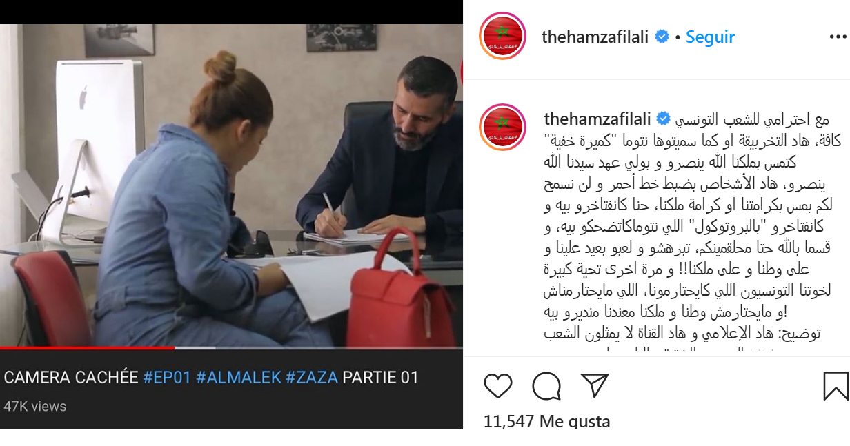 وفي هذا الصدد، قال الفنان الكوميدي المغربي حمزة الفيلالي في تدوينة على الانستغرام "مع احترامي للشعب التونسي كافة، هاد التخربيقة او كما سميتوها نتوما “كميرا خفية” كتمس بملكنا الله ينصرو و بولي عهد سيدنا الله ينصرو، هاد الأشخاص بضبط خط أحمر و لن نسمح لكم بمس بكرامتنا او كرامة ملكنا كانفتاخرو “بالبروتوكول” اللي نتوما كاتضحكو بيه".