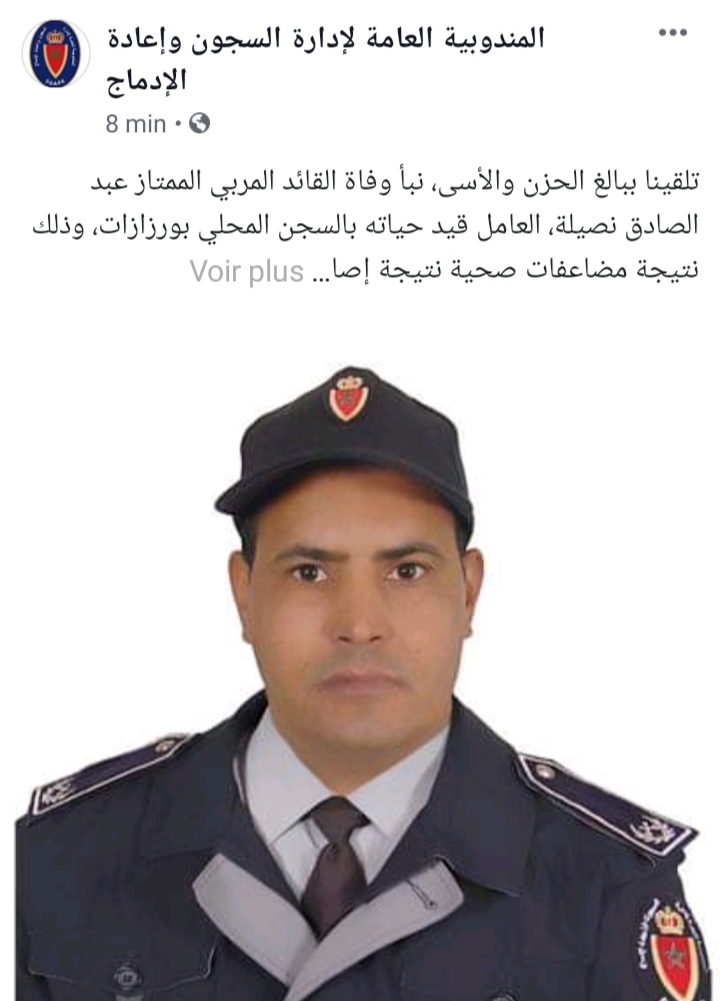 أعلنت المندوبية العامة لادارة السجون وإعادة الإدماج قبل قليل عبر صفحتها بالفيسبوك عن وفاة أحد موظفيها برتبة قائد مربي ممتاز والذي يعمل بالسجن المحلي بوارزازات، وذلك إثر مضاعفات نتيجة إصابته بفيروس كورونا.