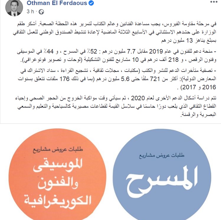 وقدم وزير الثقافة تفاصيل الدعم في تدوينة على الفايسبوك، جاء فيها:
