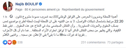 دخل الوزير السابق محمد نجيب بوليف على خط الجدل الدائر حول قانون "تكميم الأفواه" الذي بات يشغل بال الرأي العام الوطني، حيث أقدم على نشر تدوينة مثيرة على صفحته الرسمية بالفايسبوك.