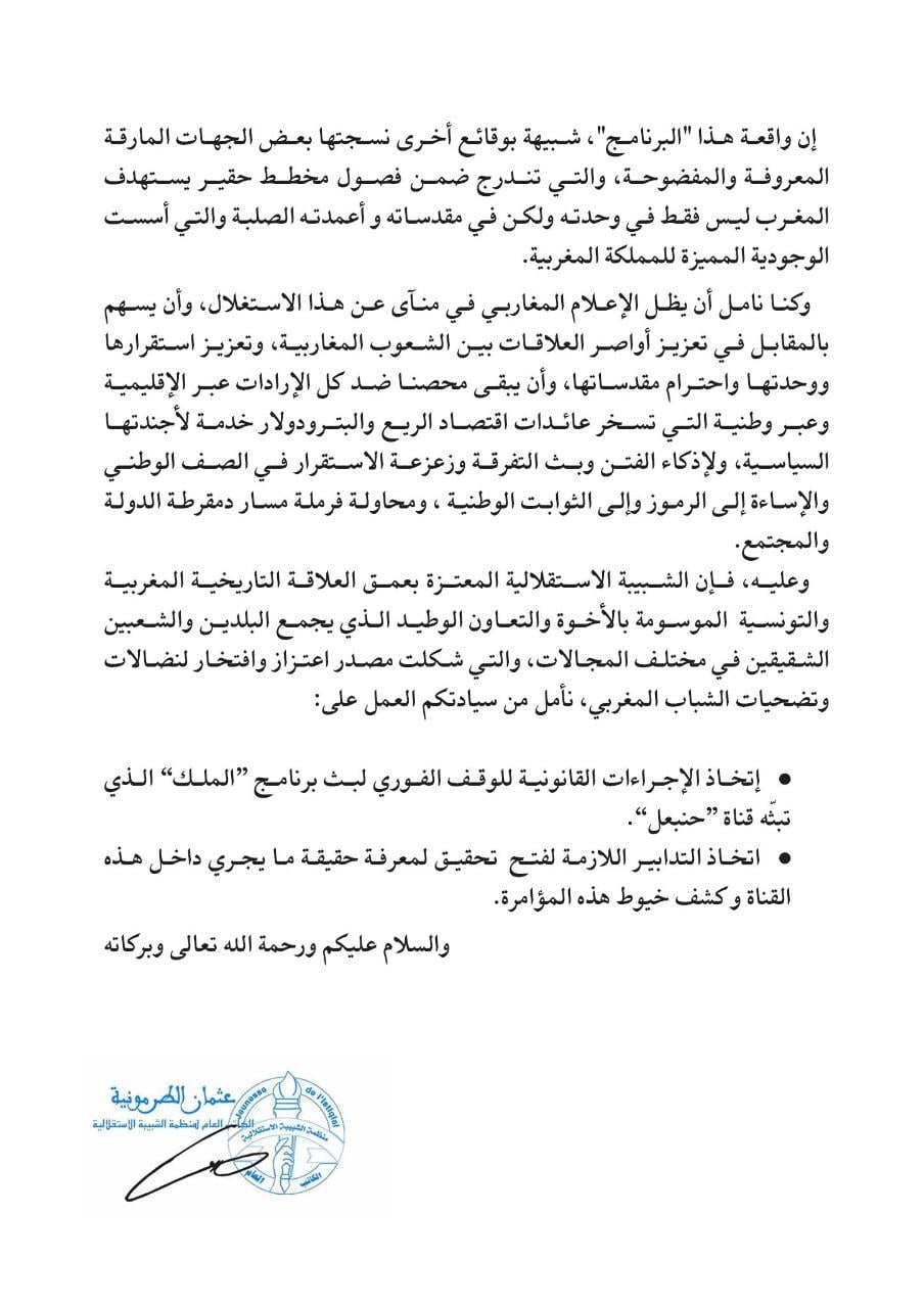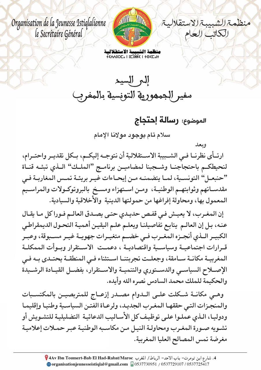 في رسالة احتجاجية وجهتها إلى سفير دولة تونس بالرباط، عبرت الشبيبة الاستقلالية عن احتجاجها وشجبها لمضامين برنامج "الملك" الذي تبثه قناة "حنبعل" التونسية، لما يتضمنه من إيحاءات غير بريئة تمس المغاربة في مقدساتهم وثوابتهم الوطنية، ومن استهزاء ومسخ  بالبروتوكولات والمراسيم المعمول بها، ومحاولة إفراغها من حمولتها الدينية والأخلاقية والسيادية.