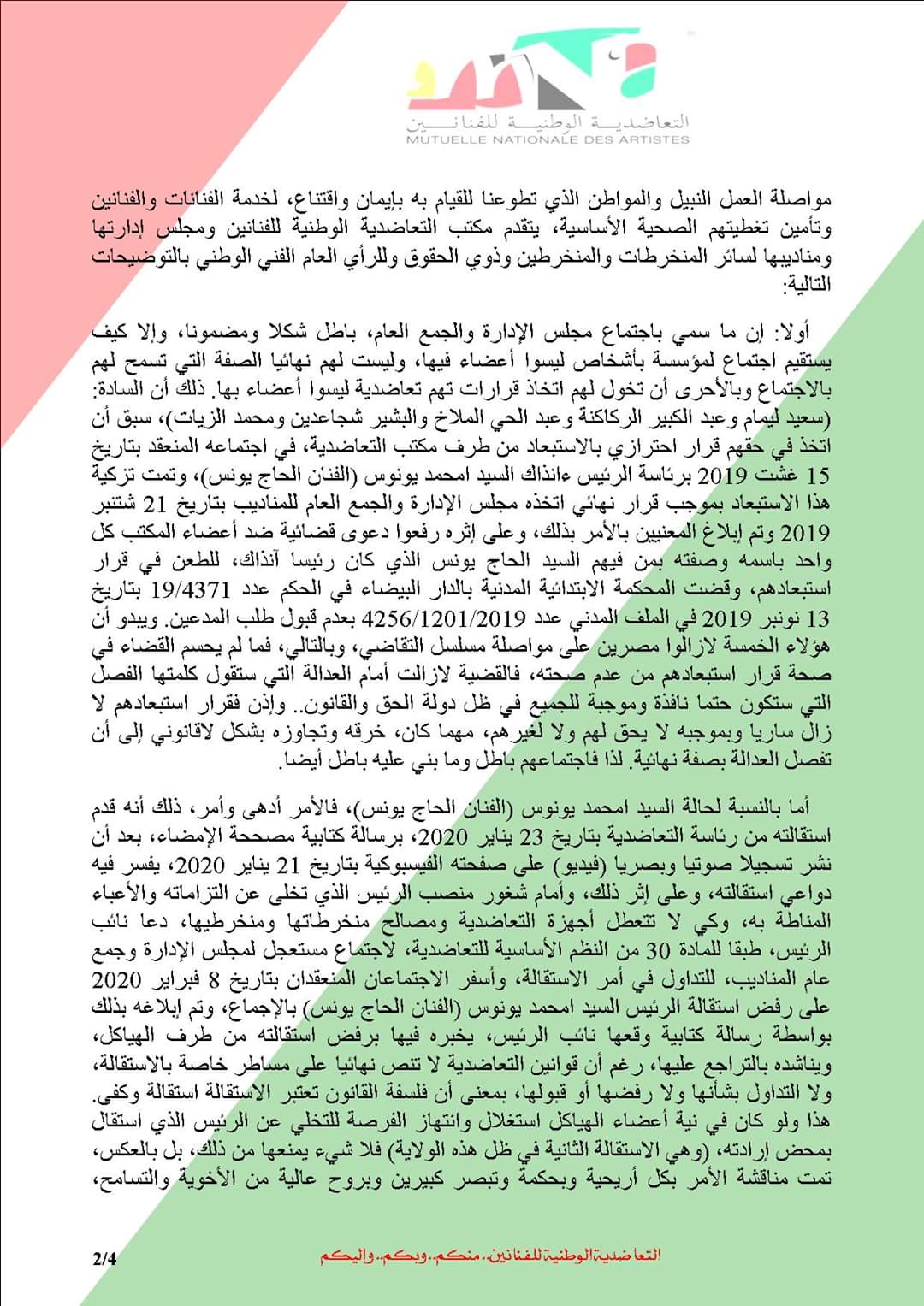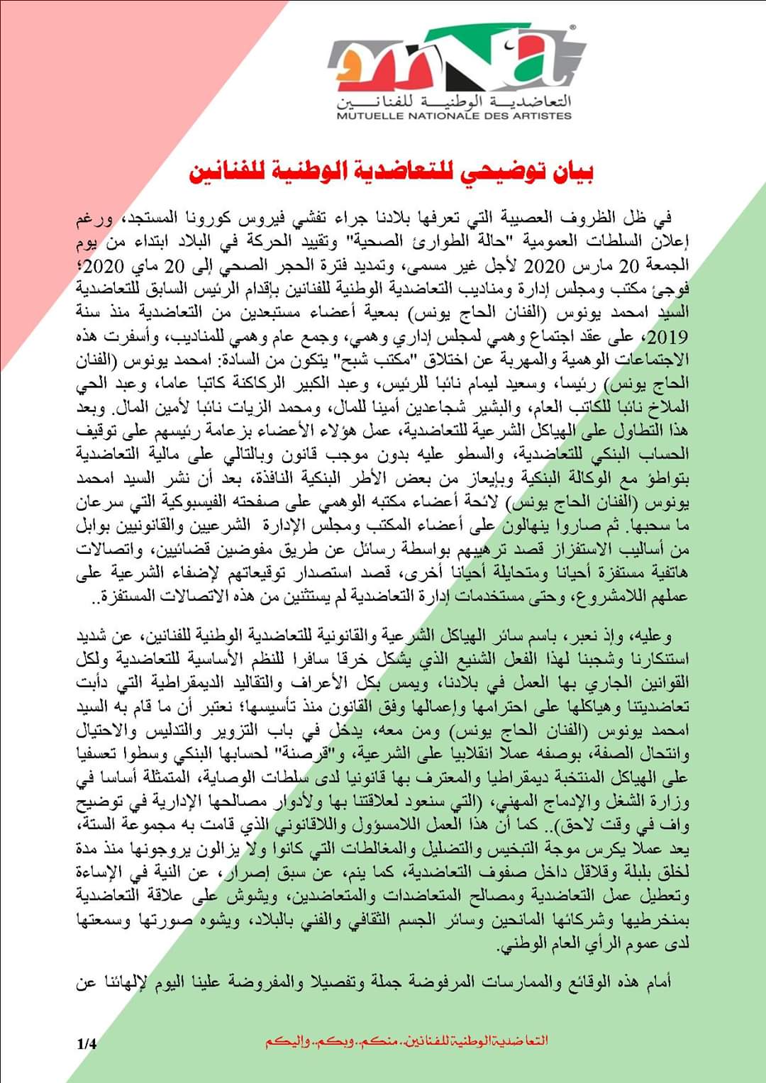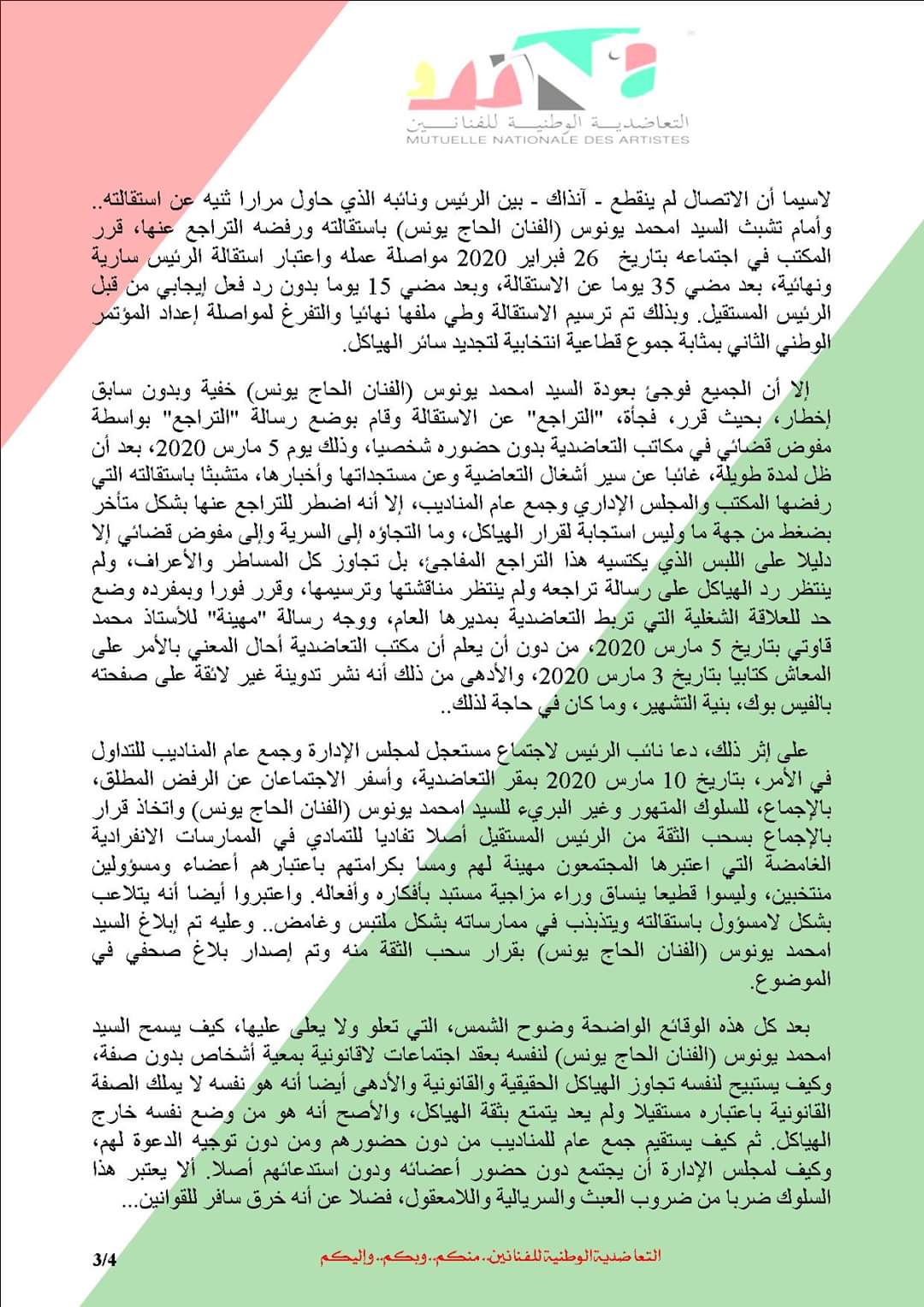 للإشارة فإن البيان المشكوك في صحته وقانونية من أصدره كان قد اتهم كذلك الحاج يونس ومن معه باتهامات أخرى خطيرة كتوقيف الحساب البنكي للتعاضدية، والسطو عليه بدون موجب قانون وبالتالي على مالية التعاضدية بتواطؤ مع الوكالة البنكية وبإيعاز من بعض الأطر البنكية النافذة، وذلك بعد أن نشر السيد امحمد يونوس (الفنان الحاج يونس) لائحة أعضاء مكتبه على صفحته الفيسبوكية التي سرعان ما سحبها.