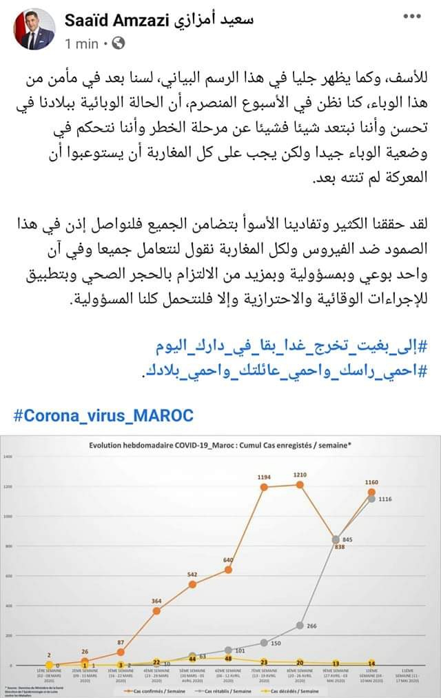 للأسف٬ وكما يظهر جليا في هذا الرسم البياني٬ لسنا بعد في مأمن من هذا الوباء، كنا نظن في الأسبوع المنصرم٬ أن الحالة الوبائية ببلادنا في تحسن، وأننا نبتعد شيئا فشيئا عن مرحلة الخطر، وأننا نتحكم في وضعية الوباء بشكل جيد، ولكن يجب على كل المغاربة أن يستوعبوا أن المعركة لم تنته بعد.