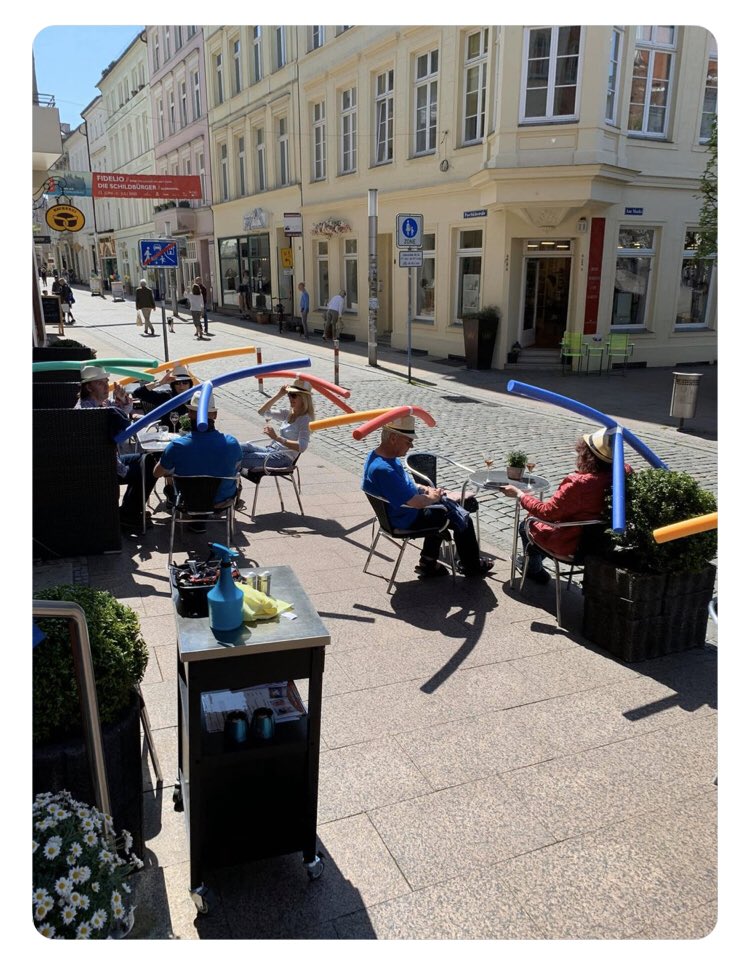 بعد أسابيع من الإغلاق بسبب إجراءات العزل، أعاد مقهى "روته" في مدينة شفيرين الألمانية فتح أبوابه ليستقبل الزبائن من جديد. ولتشجيع الزبائن على المحافظة على التباعد الاجتماعي، أصبح المقهى يوزع عليهم قبعات قش عليها عصي سباحة إسفنجية ملونة. وفي صورة نشرها المقهى على صفحته على فيسبوك، يظهر الزبائن وهم يرتدون تلك القبعات، في مشهد طريف.