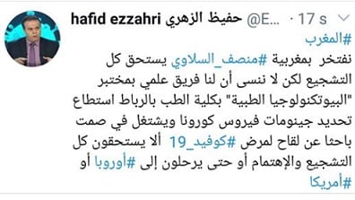 وجاء في تغريدة "الزهري":"نفتخر بمغربية منصف السلاوي يستحق كل التشجيع، لكن لا ننسى أن لنا فريق علمي بمختبر البيونكنولوجيا الطبية بكلية الطب بالرباط استطاع تحديد جينومات فيروس كورونا ويشتغل في صمت باحثا عن لقاح لمرض كوفيد 19، ألا يستحقون كل التشجيع والاهتمام أو حتى يرحلون إلى أوروبا وأمريكا؟".