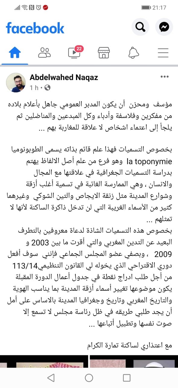 ونشر المستشار البيجيدي "النقاز" تدوينة نارية عبر حسابه الفيسبوكي، جاء فيها: "مؤسف ومحزن أن يكون المدبر العمومي جاهل بأعلام بلاده من مفكرين وفلاسفة وأدباء وكل المبدعين والمناضلين ثم يلجأ إلى اعتماء اشخاص لا علاقة للمغاربة بهم".