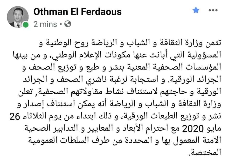 وقال الفردوس في تدوينة فايسبوكية أن الوزارة "تثمن روح الوطنية و المسؤولية التي أبانت عنها مكونات الإعلام الوطني، ومن بينها المؤسسات الصحفية المعنية بنشر وطبع و توزيع الصحف والجرائد الورقية" موضحا أن هذا القرار جاء " استجابة لرغبة ناشري الصحف والجرائد الورقية وحاجتهم لاستئناف نشاط مقاولاتهم الصحفية".