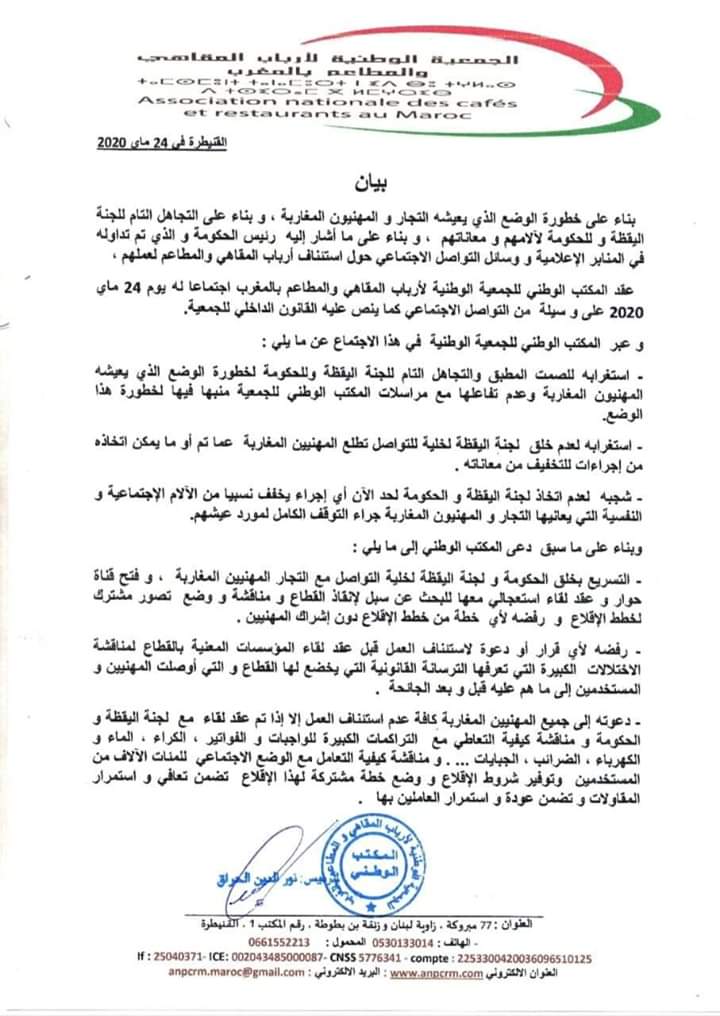 في الوقت الذي تجري فيه استعدادات من وزارة الداخلية لاعادة فتح المقاهي والمطاعم بشكل تدريجي بالمغرب ، على أن تلتزم هذه الفضاءات بالتدابير والاجراءات الوقائية لمنع انتشار فيروس كورونا ، خرجت الجمعية الوطنية لأرباب المقاهي والمطاعم في المغرب ببلاغ توصل الموقع بنسخة منه، تعلن فيه عن رفضها للعودة للعمل مادام ان لجنة اليقظة لم تفتح مع المهنيين حوارا لتقييم الأضرار وتعويضهم عنها .