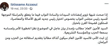 بيد أن ما زاد الطين بلة، هو ما صرحت به البرلمانية "إبتسام العزاوي"، التي أدرج اسمها ضمن لائحة الموقعين على قرار الإطاحة بـ "أبودرار"، حيث نشرت تدوينة عبر حسابها الفيسبوكي، جاء فيها: "إذا صحت شبهة تزوير إمضاءات السيدات والسادة النواب، فيما ما يتعلق بالمراسلة الموجهة للسيد رئيس مجلس النواب، بخصوص اختيار رئيس جديد لفريق الأصالة والمعاصرة، فستكون فضيحة القرن بامتياز"، قبل أ تواصل قائلة: "السيد الأمين العام مطالب بإصدار بيان عاجل في الموضوع، نظرا لخطورة الأمر، و لمساسه بسمعة الحزب وبالمؤسسة التشريعية إن ثبت الأمر، فالسيد الأمين العام سيكون آنذاك مطالبا بتقديم استقالته من الحزب ومن البرلمان".