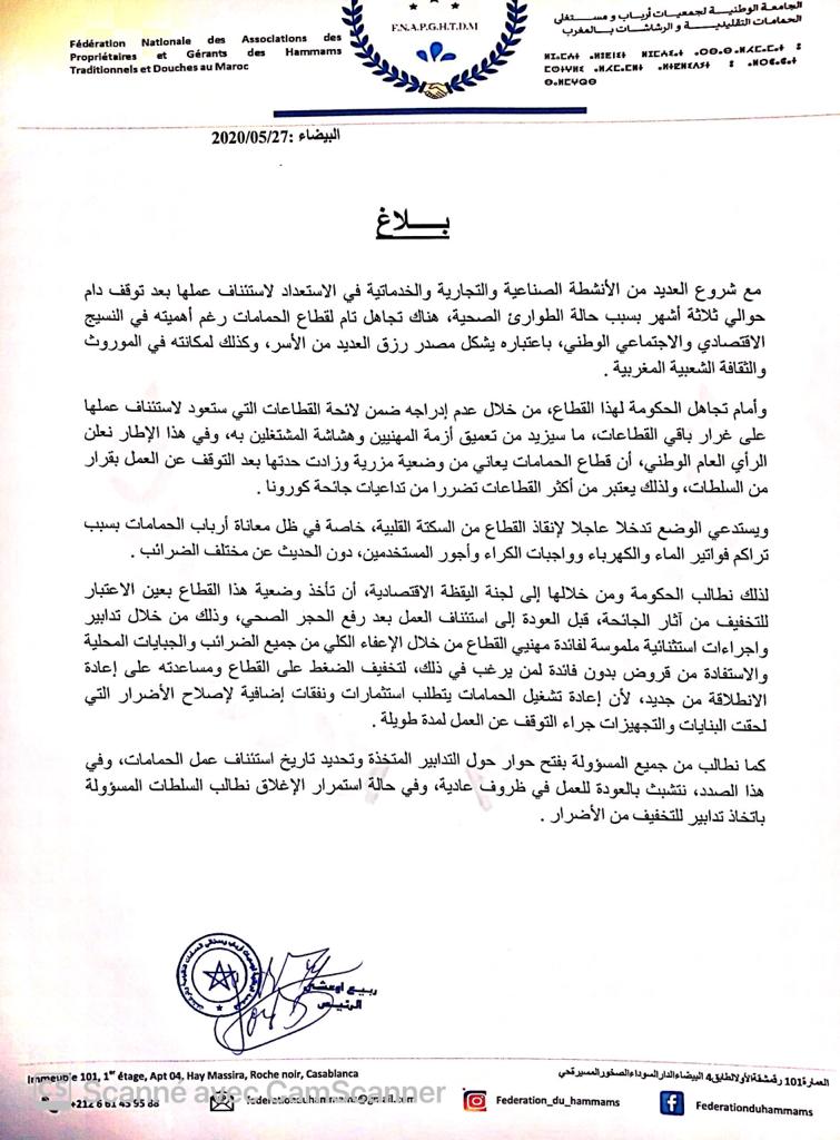 اعتبرت الجامعة الوطنية لجمعيات أرباب ومستغلي الحمامات التقليدية والرشاشات بالمغرب أن هناك تجاهلا لقطاع الحمامات رغم أهميته في النسيج الإقتصادي والإجتماعي الوطني، كونه يشكل مصدر رزق العديد من الأسر، وكذا لمكانته في الموروث والثقافة الشعبيين المغربيين، في ظل شروع العديد من الأنشطة الصناعية والتجارية والخدماتية في الإستعداد لاستئناف عملها بعد توقف دام حوالي 3 أشهر بسبب حالة الطوارئ الصحية.
