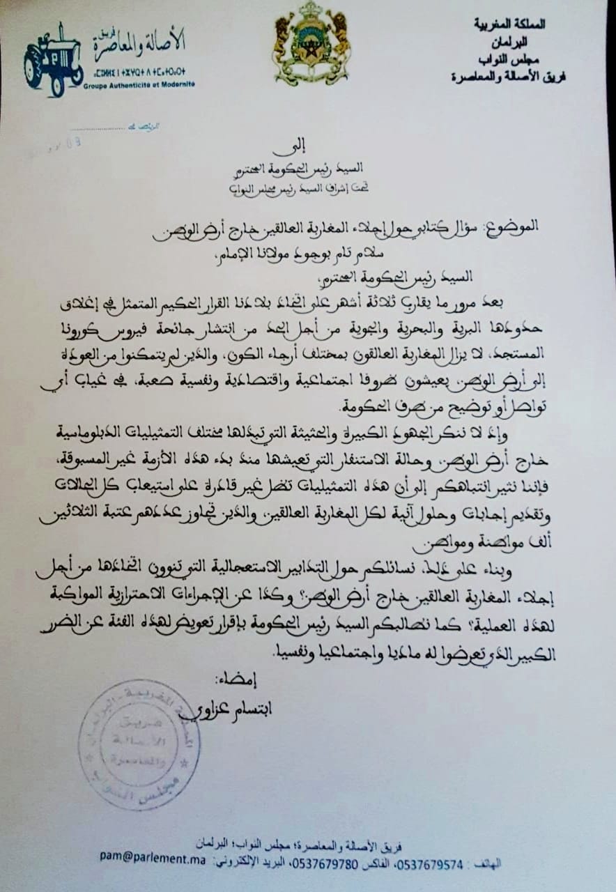 وأضافت "وإذ لا ننكر الجهود الكبيرة والحثيثة التي تبذلها مختلف التمثيليات الديبلوماسية خارج أرض الوطن، وحالة الاستنفار التي تعيشها منذ بداية هذه الأزمة غير المسبوقة، فإننا نثير انتباهكم إلى أن هذا التمثيليات غير قادرة على إستيعاب كل الحالات وتقديم إجابات وحلول آنية لكل المغاربة العالقين والذين يتجاوز عددهم عتبة الثلاثين ألف مواطنة ومواطن".