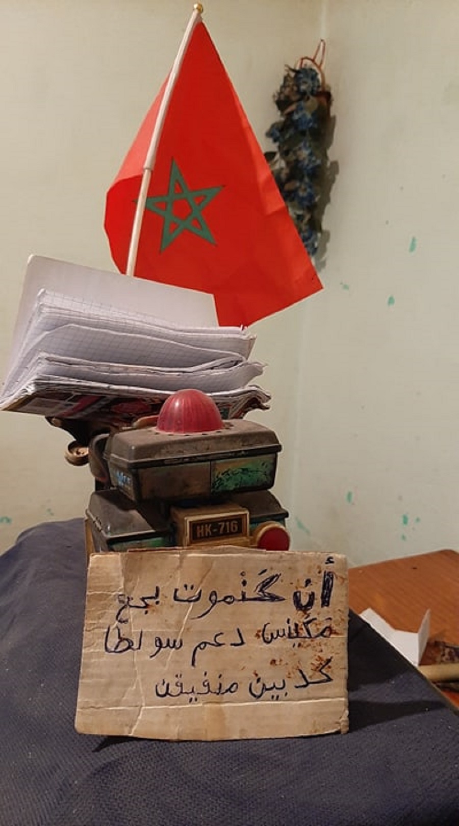 ووضع الهالك قطرات من دمه على الرسالة بجانب العلم المغربي وأشياء متهالكة.