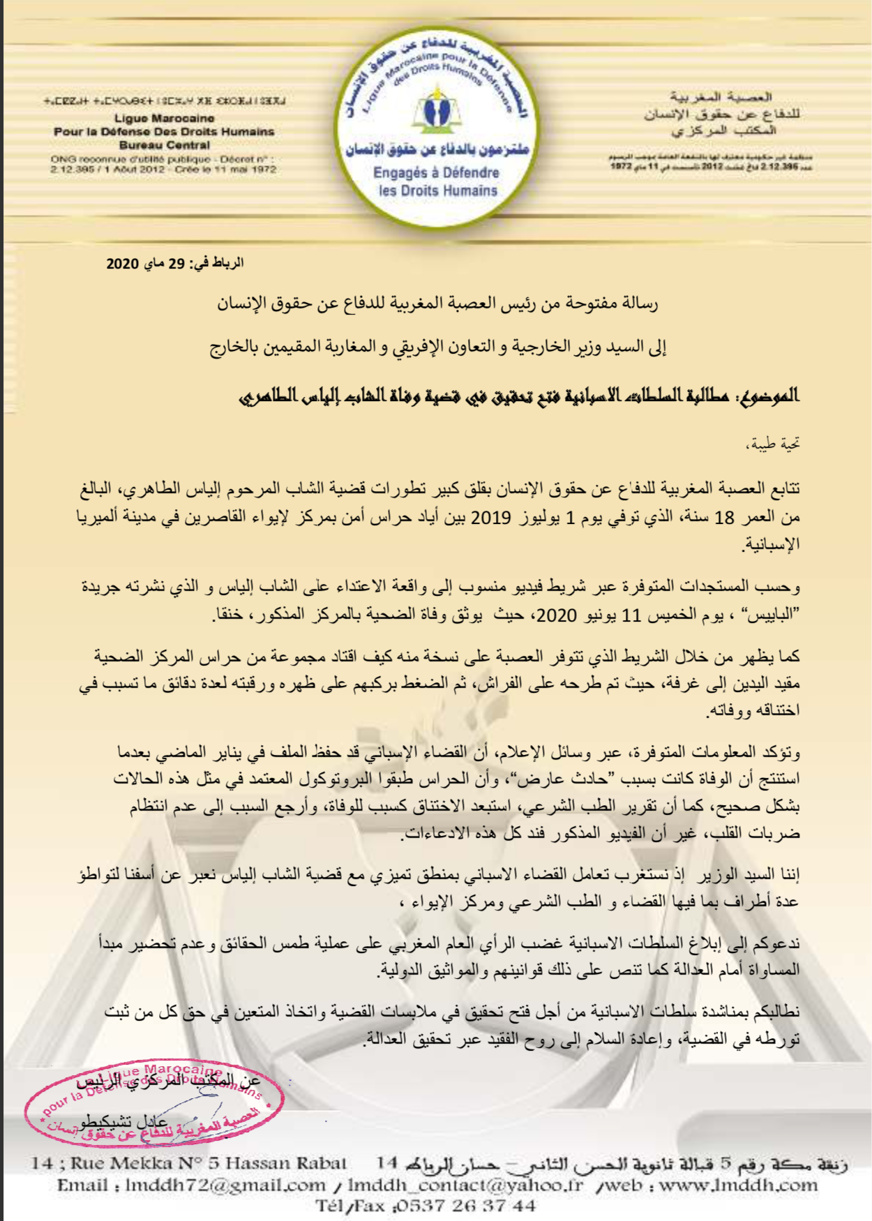 في رسالة إلى السيد وزير الخارجية والتعاون الإفريقي والمغاربة المقيمين بالخارج، طالب السيد "عادل تشيكيطو"، رئيس "العصبة المغربية للدفاع عن حقوق الإنسان"، السلطات الاسبانية، بفتح تحقيق في قضية وفاة الشاب "إلياس الطاهري"، حيث أكد "تشيكيطو" أن العصبة المغربية تابعت بقلق كبير تطورات قضية الشاب البالغ من العمر 18 سنة، والذي توفي يوم 1 يوليوز 2019 بين أياد حراس أمن بمركز لإيواء القاصرين في مدينة ألميريا الإسبانية.
