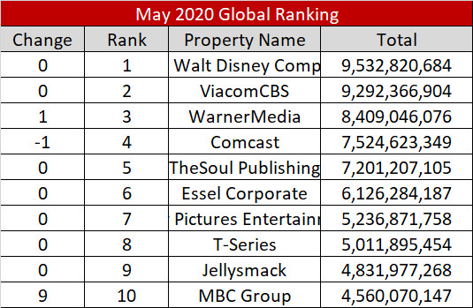 يذكر أن أول 10 منصات احتلّت صدارة الترتيب العالمي لشهر مايو 2020 هي: The Walt Disney Company، ) ViacomCBS، WarnerMedia، Comcast، TheSoul Publishing، Essel Corporate،Sony Pictures Entertainment، T-Series، )Jellysmack، MBC Group.