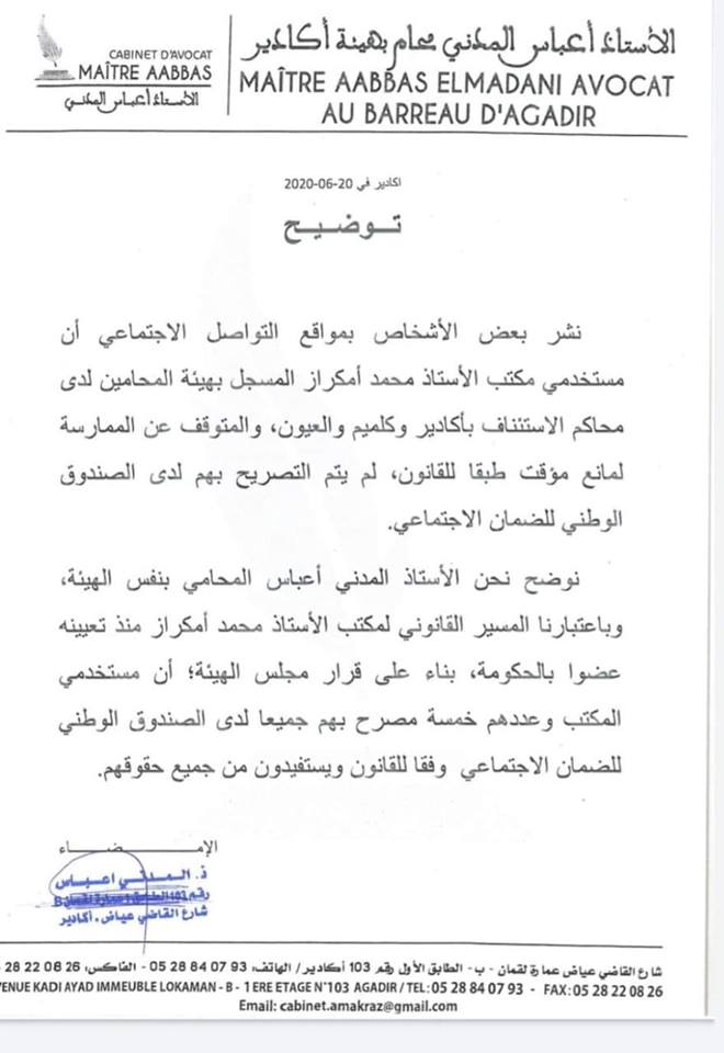بتزامن مع الإتهامات التي وُجهت لمصطفى الرميد، وزير حقوق الإنسان، بعدم تسجيل كاتبته بمكتبه الخاص بالمحاماة بالدار البيضاء، وهي اتهامات يبدو أنها ورطت مبدئيا قيادي العدالة والتنمية وأحرجت معه حزبه كذلك، خصوصا في ظل الدفوعات والتبريرات التي تصدى كثيرون للدفع بها والدفاع عن السيد الوزير، والتي كانت في مجملها واهية بل ومثيرة للإستغراب َالشفقة أحيانا، ليبدأ الحديث عن اتهامات مماثلة لزميل الرميد في الحزب والحكومة والمحاماة، محمد أمكراز وزير الشغل والإدماج المهني، والذي يتولى بحكم صفته كذلك مهمة رئيس المجلس الإداري للصندوق الوطني للضمان الإجتماعي، قبل أن يخرج المحامي المدني أعباس، من هيئة أكادير، والمسير القانوني لمكتب محمد أمكراز، منذ تعيين الأخير وزيرا في حكومة العثماني، مؤكدا أن جميع مستخدمي المكتب وعددهم خمسة (5)، مصرح بهم لدى الصندوق الوطني للضمان الاجتماعي وفقا للقانون.