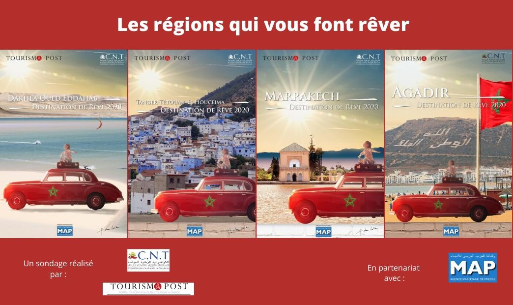 كشفت نتائج استطلاع للرأي أنجزته به كل من "توريزم بوست" (Tourisma Post) والكونفدرالية الوطنية للسياحة (CNT)، حول الجهات المفضلة لدى رواد الأنترنيت ، أن جهات "الداخلة واد الذهب"، و"طنجة - تطوان-الحسيمة"، و"مراكش-آسفي"، و"أكادير سوس ماسة"، تجعل المغاربة يحلمون أكثر .