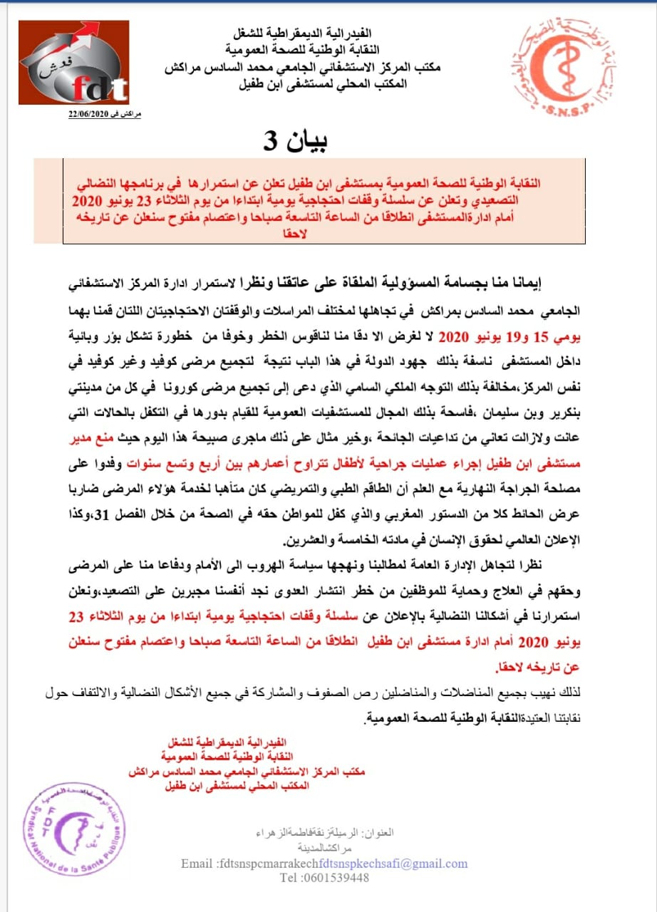 هذا وأكد أصحاب البيان النقابي أن إدارة المركز الإستشفائي الجامعي بمراكش، وبنهجها ما وصفوه بسياسة الهروب للأمام، دفعتهم للإستمرار في أشكالهم النضالية التصعيديّة بالإعلان عن وقفات احتجاجية إبتداء من صباح يوم غد الثلاثاء أمام إدارة مستشفى ابن طفيل، واعتصاما مفتوحا سيعلن عن تاريخه لاحقا.