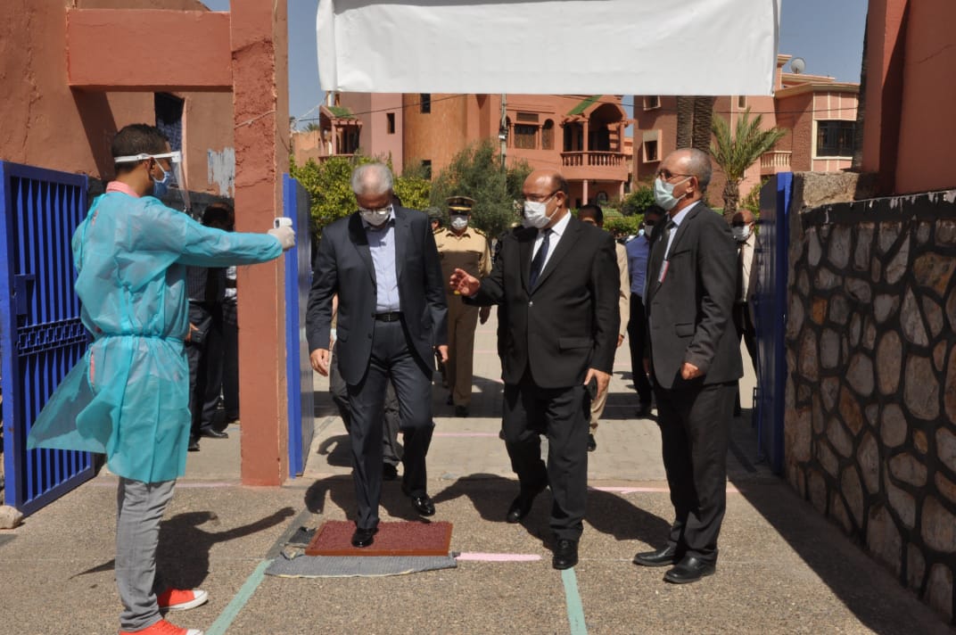 في إطار تفقد مراكز امتحانات البكالوريا بجهة مراكش آسفي، والاطلاع على كافة الترتيبات التنظيمية والتدابير الاحترازية المتخذة من أجل الحفاظ على صحة وسلامة جميع المترشحات والمترشحين وكافة الأطر التربوية والإدارية وكل المتدخلين في هذه المحطة الإشهادية الهامة، قام السيد كريم قسي لحلو، والي الجهة وعامل عمالة مراكش مرفوقا باللجنة الجهوية الأمنية، وبالسيد مدير الأكاديمية الجهوية للتربية والتكوين لجهة مراكش آسفي والسيد المدير الإقليمي للتربية الوطنية بمراكش، بزيارة لعينة من مراكز الامتحان المعتمدة لاستقبال المترشحات والمترشحين للامتحان الوطني لنيل شهادة البكالوريا دورة 2020، الذي ينظم هذه السنة، في ظروف احترازية ووقائية استثنائية خاصة، للتصدي لوباء كورونا - كوفيد19.