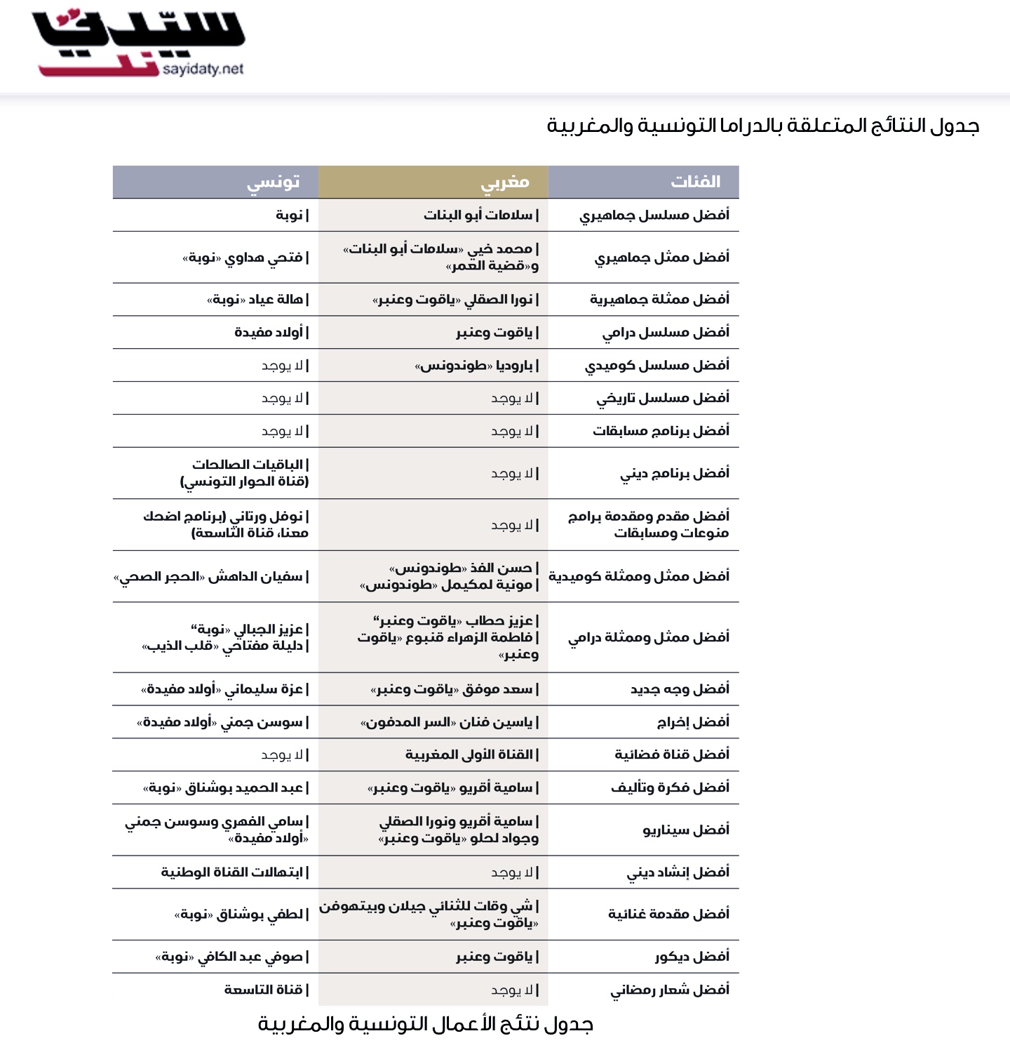 وفيما يتعلق بالأعمال المغربية التي دخلت في منافسة قوية مع نظيرتها في تونس، فقد أسفرت النتائج المعلن عنها كما يوضح الجدول أسفله (الصورة)، عن احتكار نجوم المسلسل الدرامي "ياقوت وعنبر"، لمخرجه "محمد نصرات" لجل الجوائز المتبارى عليها، فيما كانت المفاجأة الكبرى، هي تتويج الفنانة "مونيا لمكيمل" بجائزة أحسن ممثلة كوميدية في المغرب لهذا الموسم، عن دورها في السلسلة الكوميدية "طوندونس"، إلى جانب الفنان الكبير "حسن الفد" الذي توج كما كان متوقعا بجائزة أفضل كوميدي، فيما توجت القناة "الأولى" بجائزة أفضل قناة في المغرب.