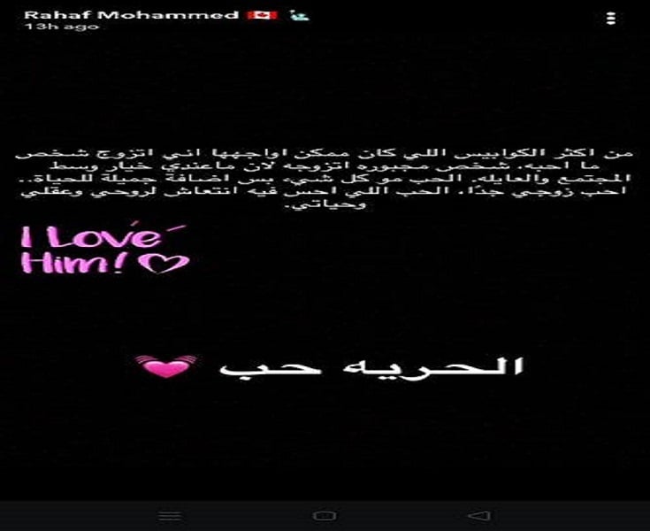 وقالت رهف عبر حسابها في تطبيق "سناب شات"، أن طفلها الذي أنجبته مؤخرا، هو طفل شرعي ناتج عن زواج رسمي من زوجها ، مضيفة "من أكثر الكوابيس اللي كان ممكن أن أواجهها هو أن أتزوج شخصا ما أحبه، شخص مجبورة أتزوجه لأن ما عندي خيار وسط المجتمع والعائلة".