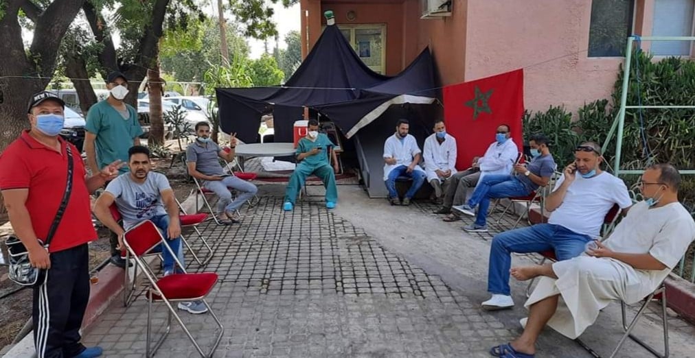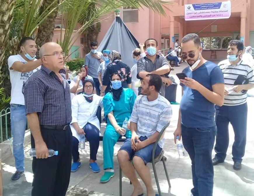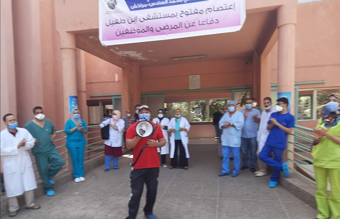 تواصل الشغيلة الصحية بمستشفى ابن طفيل (سيفيل) بمراكش معتصمها المفتوح في يومه 21. معتصم دعا له المكتب المحلي للنقابة الوطنية للصحة العمومية (فدش)، ردا على ما وصفه المكتب بتجاهل الإدارة العامة للمركز الإستشفائي الجامعي محمد السادس بمراكش لمطالبه، واستمرارها في سد باب الحوار و سلك سياسة الآذان الصماء ونهجها سياسة الهروب الى الأمام، ودفاعا منه عن المرضى وحقهم في العلاج وحماية للموظفين والمرتفقين من خطر تشكل بؤر وبائية داخل أسوار مستشفى ابن طفيل، من خلال محاولة تجميع مرضى كوفيد وغير كوفيد في غياب أدنى شروط السلامة، واقدام الادارة المركزية و ادارة المستشفى على حذف مركب العمليات الجراحية السريعة المقدمة في إطار الاستشفاء النهاري، وتحويله إلى جناح للإنعاش خاص بمرضى "كوفيد-19″، بطاقة استيعابية تصل إلى أكثر من 15 سريرا.