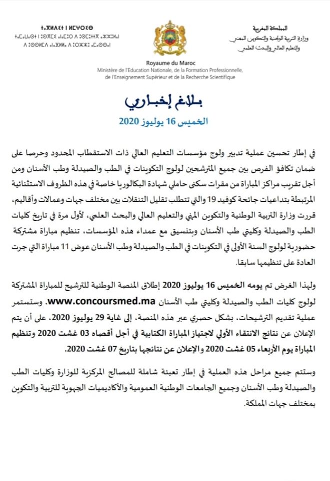 وكشف بلاغ صادر عن الوزارة، أنه ولهذا الغرض، تم اليوم الخميس 16 يوليوز الجاري إطلاق المنصة الوطنية للترشيح للمباراة المشتركة لولوج كليات الطب والصيدلة وكليتي طب الأسنان www.concoursmed.ma.