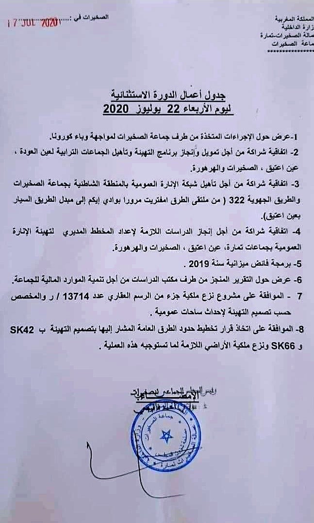 بالقصر الدولي محمد السادس بالصخيرات، عقد المجلس الجماعي للمدينة، دورة استثنائية، خصص جدول أعمالها للمصادقة على عدد من المشاريع الهامة التي كانت مطلبا أساسيا للساكنة (الصورة).