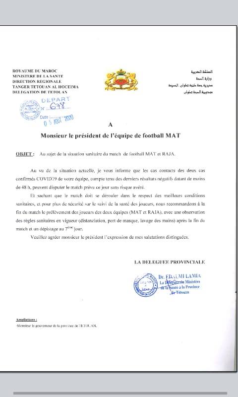 وتوصلت "أخبارنا" بوثيقة صادرة عن مندوبية الصحة بتطوان، موجهة لرئيس المغرب التطواني، تفيد أن الحالات المخالطة للاعبين المصابين حمزة الموساوي وكمال بلعربي، بإمكانها خوض اللقاء بدون أي مخاطر.